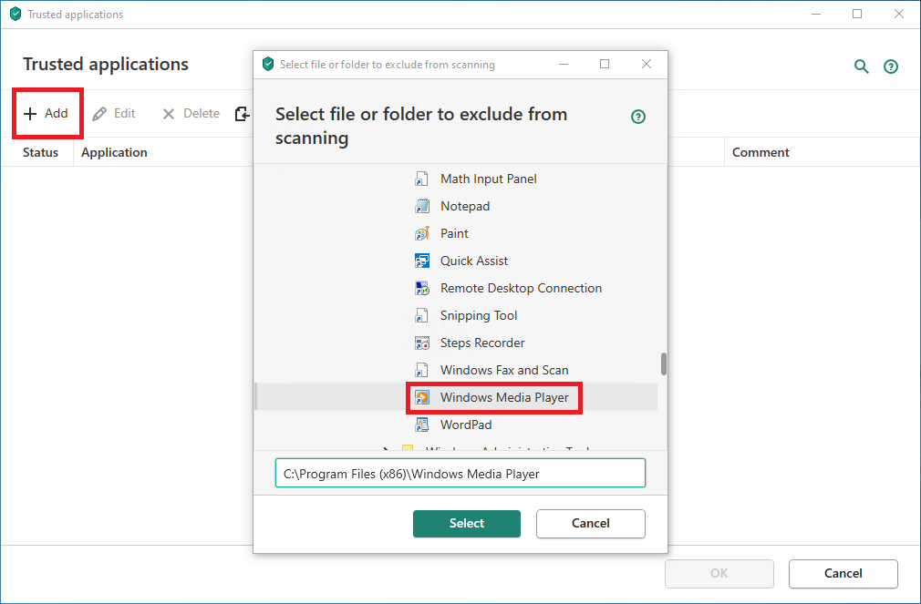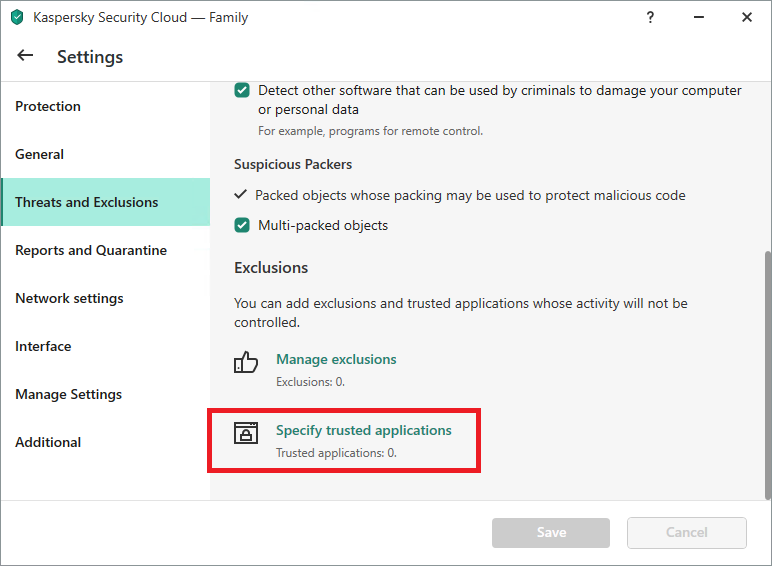 The Trusted applications settings in Kaspersky Internet Security, Kaspersky Total Security, and Kaspersky Security Cloud