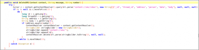 When all the SMSs have been uploaded to the C2 server, the malware can also delete all the SMSs from the victim’s mobile device.
