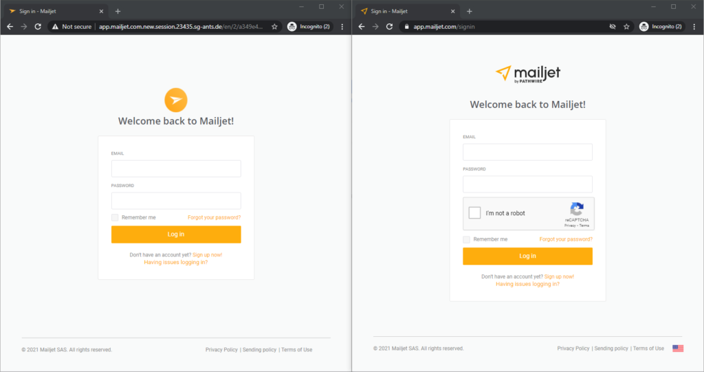 At this point, readers won’t be surprised to learn that any data entered on the fake login page goes straight to the cybercriminals behind the scam. Note, however, that in addition to the misdirection, the fake site transmits the data it harvests over an unprotected channel. The attackers didn’t even bother to replicate the CAPTCHA, although they did insert an example in the e-mail field. We should see a flag in the lower right corner as well. But most users are unlikely to spot those discrepancies.